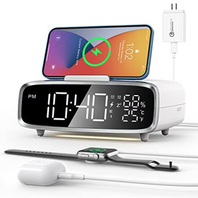 The BUFFBEE Alarm Clock with Wireless Charger is a versatile and functional bedside digital clock that also serves as a charging station for your iPhone and Apple Watch. With a sleek 2-in-1 design, this alarm clock allows you to charge both your phone and watch in one place, keeping your bedside table organized and freeing up outlets. It features a fully adjustable display dimmer, allowing you to customize the brightness to your preference. The alarm clock is equipped with a 3-level adjustable volume beeping alarm that is loud enough to wake you up in the morning. It is compatible with a wide range of iPhones and Samsung phones, as well as iWatch models. The built-in chip provides multiple protection features, including protection against overheating, overcharging, overvoltage, and overcurrent. The non-slip pad and professional heat dissipation ensure the safety of your devices. The LED indicator shows the charging status of your phone and automatically turns off after 5 seconds to avoid disturbing your sleep. The BUFFBEE Alarm Clock with Wireless Charger is a convenient and reliable charging solution for your mobile devices.