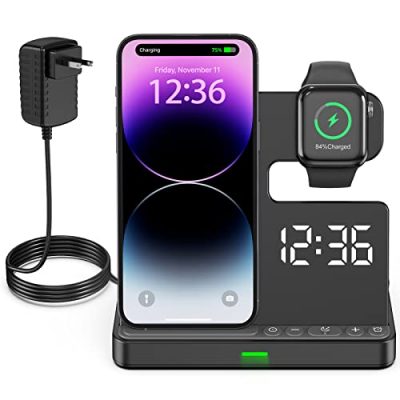 The Buffbee Alarm Clock with Wireless Charging is a convenient 2 in 1 charger station for your iPhone and Apple Watch. Its sleek design combines a wireless charger with an alarm clock, allowing you to charge both devices on one device. With a dimmable display and adjustable volume alarm, this alarm clock is perfect for waking you up in the morning. It is compatible with a wide range of devices and offers multiple protections against overheating and overcharging. The Buffbee Alarm Clock also features a sleep-friendly indicator that automatically turns off after 5 seconds. However, some users have reported issues with phone sliding and limited power. Overall, this product provides a practical solution for organizing your bedside table and charging your devices.