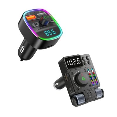 The Nulaxy Car Bluetooth Transmitter-KM30 & 2023 Upgraded Bluetooth V5.3 Car FM Transmitter-KM34 is a versatile device that provides convenient hands-free driving and in-car stereo streaming. The KM30 features a large display screen for easy visibility of important information like phone numbers, track names, FM frequencies, and battery voltage. It also has a superior microphone for better call quality and a QC3.0 charging port for fast charging. On the other hand, the KM34 boasts the latest Bluetooth 5.3 technology for seamless pairing, enhanced audio streaming, and immersive hands-free calling. It also offers a unique scroll wheel design to adjust bass and treble effects and a LED color spectrum that syncs with your music, creating an enjoyable atmosphere. With its compact size, this Bluetooth transmitter is a perfect addition to any car setup.