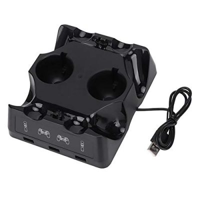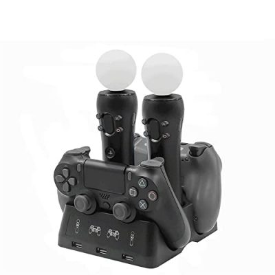 The Hdiwousp PS4 Controller Charger Station is a 4-in-1 charging dock that allows you to charge two PS4 controllers and two PS VR controllers simultaneously. It also doubles as a storage station, helping to keep your gaming area neat and tidy. The LED charging indicator informs you about the charging status of your controllers, and the fast charging feature ensures a quick recharge time of 2-4 hours. With three USB charging ports, you can charge other devices alongside your controllers. This charger is designed specifically for PS4 and PS Move controllers and comes in a sleek black color. Overall, it offers efficient charging, easy usability, and compatibility with your PS4 gaming accessories.