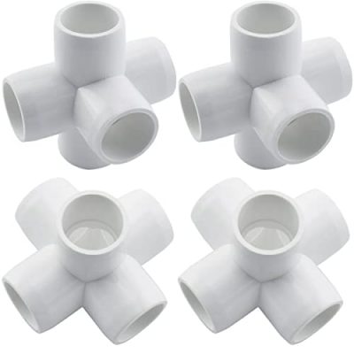 - Shaped like a plus sign (+), these connectors allow four PVC pipes to intersect at a central point.