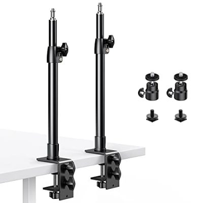 The Dazzne 2-Pack Camera Desk Mount Stand is a versatile and adjustable stand that is compatible with various devices like ring lights, video cameras, smartphones, and panel lights. Whether you're doing video recording, film shooting, live streaming, or photography lighting, this stand is a great companion. It offers adjustable height from 12.9 inches to 22 inches, allowing you to find the perfect working position. The 360° ball head provides flexibility in changing the angle of your camera or phone, making it easier to capture the desired shots. Made of durable aluminum alloy, this stand can support heavy photography equipment. With its c-clamp and cold shoe adapter, it offers convenience and stability. Overall, the Dazzne Camera Desk Mount Stand is a reliable and practical accessory for photographers and videographers.
