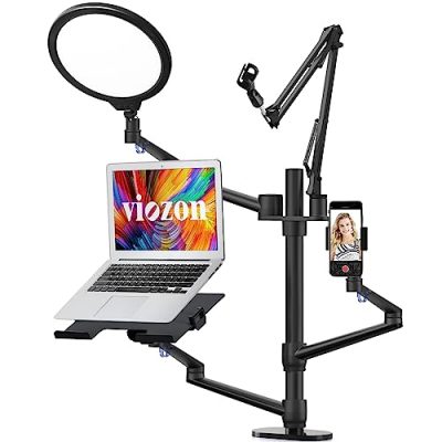 The Viozon Selfie Desktop Live Stand Set is a versatile 6-in-1 mount with a 10" LED ring light and microphone mount. It offers high compatibility, allowing you to switch between different devices such as laptops, monitors, mobile phones, cameras, and tablets. The ring light features adjustable brightness and color tone, with three-stage color tones to choose from. The stand provides perfect recording and live broadcast solutions, making it ideal for online education, meetings, professional recording, and streaming. Made of strong and durable aluminum alloy, the stand is designed with a stylish and simple aesthetic. The C clamp design ensures compatibility with various desktop sizes. With high integration and sturdiness, this stand is a convenient and efficient solution for organizing your workspace. Overall, it offers great value for its price.