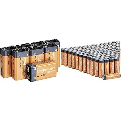 The Amazon Basics 100 Pack AA High-Performance Alkaline Batteries are a great bulk-buy option that provides a 10-year shelf life. These 1.5-volt batteries are perfect for storing for emergencies or for immediate use. With an improved design and anti-corrosion components, they ensure a leak-free seal that locks in the power until needed. They deliver the right amount of power for various devices such as game controllers, toys, flashlights, digital cameras, and more. The pack is certified frustration-free and comes with a 1-year limited warranty. Additionally, the 8-pack 9 Volt Performance All-Purpose Alkaline Batteries, with a 5-year shelf life, are ideal for household items like garage door openers, smoke detectors, and radios.