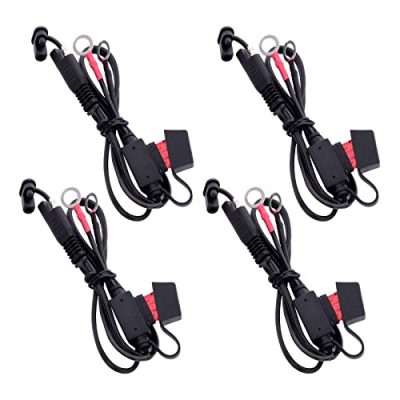 The TOPDC 4 PCS 22" 10A Fused Ring Terminal Harness Quick Connect Extention Cord for Battery Charger/Maintainer is a convenient and easy-to-use accessory for charging batteries. With an extra-long cable and a ring terminal that easily connects to batteries, it is perfect for multi-vehicle use. The included end cap ensures the connection stays in good condition when not in use. This harness is compatible with most battery chargers and can be used on automotive, motorcycle, boat, RV, power tool, and lawn & garden battery systems. It comes with a 10 Amp fuse and has received positive reviews for its quality and functionality.