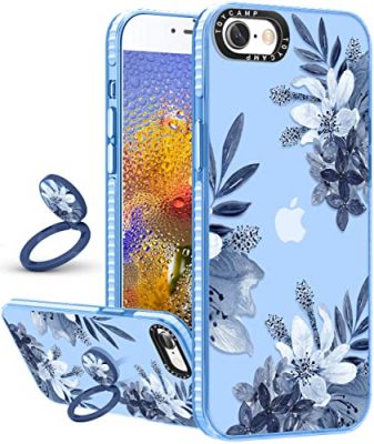 The Toycamp for iPhone 6/6S/7/8/SE case with a blue flowers design is a stylish and protective phone cover for women, boys, and girls. It features a built-in shockproof bumper, raised lip for camera and screen protection, and a multi-layer buffer structure to safeguard your iPhone from drops and scratches. The case is made from superior quality TPU, which is soft, durable, and lightweight. It also includes a removable 360° swivel stand ring that allows for adjustable viewing angles and hands-free usage. With precise cutouts, it provides complete access to all buttons, ports, and wireless charging. The cute and elegant floral design adds a fashionable touch to your phone. Overall, it is a perfect gift for yourself or your loved ones.