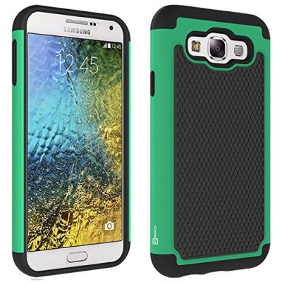 The CoverON HexaGuard Series protective hard hybrid case is designed for the Samsung Galaxy E5. It features a hard polycarbonate outer layer combined with a soft flexible rubber silicone inner layer for maximum protection. The case also provides an enhanced "basketball" grip on the back, making it easier to hold. Despite its protective features, this case is thin and lightweight compared to other dual layer cases. It comes with a 90-day manufacturer warranty. The color option available for this case is Teal on Black.