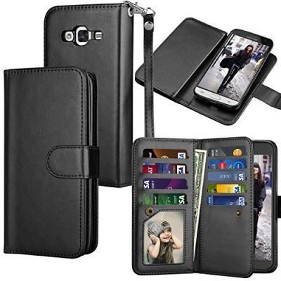 The Asuwish Compatible with Samsung Galaxy J3 2016/J 3 V/J36V/Sky/Amp Prime Wallet Case is a stylish and functional accessory for your phone. It is specifically designed for the Samsung Galaxy J3 2016/J3V/J36V/Sky/Sol/Express Prime/Amp Prime models and features a tempered glass screen protector and a detachable wrist strap. The case also includes 3 card slots to securely hold your cards and some cash. The kickstand can be easily converted into a multi-angle view, making it convenient for reading, watching videos, or facetime calls. The case is available in black color and comes with a premium service, offering 24 hours of professional and nice customer support. It also comes with a warranty for free replacement or full refund if any defects are found. Overall, it provides both style and functionality to protect and enhance your Samsung Galaxy J3.