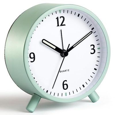 The Analog Alarm Clock – 4 Inch Desk Clock for Office is a small and elegant alarm clock designed with bold digits and made of high-quality metal. This retro-style clock is perfect for decorating bedrooms, desks, and living rooms. It features a super silent quartz movement, ensuring complete silence and accurate time. The clock includes a snooze function, a night light, and easy-to-read and operate dial face. Powered by a single AA battery, it is a convenient travel companion and backup during power outages. The clock comes in a stylish green color with green feet.