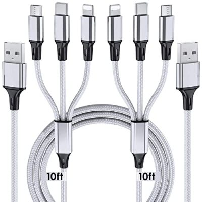 The 4 in 1 Multi Charger Cable is a versatile and convenient charging cable that supports fast charging for various cell phones. With its 4 different USB ports, including dual iOS, Micro-USB, and USB-C support, it is compatible with most devices on the market. The cable features a unique design with a special indicator light, making it ideal for charging at night. It is also 10ft/3m long, lightweight, and portable, perfect for use in the car, office, home, or while traveling. Made with durable nylon braiding and an aluminum alloy casing, this cable ensures long-lasting durability. The pack includes 2 10ft cables, and customer reviews highlight its quality, convenience, and effectiveness.