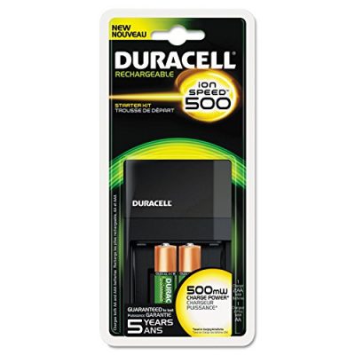 The Duracell Ion Speed 500 Battery Charger is a rechargeable starter kit that guarantees to last 5 years. With a charge power of 500 mw, it offers a high-capacity recharge for your batteries. The charger can charge in pairs only, taking about 14-15 hours for each recharge. It automatically shuts off when batteries are fully charged but cannot monitor the status of each cell individually, making it a semi-smart charger. The package includes two 'Ion Core' pre-charged AA batteries with a capacity of 2400mAh. The charger is a good value option when purchased at a discounted price. Overall, it provides a reliable charging solution for your batteries.