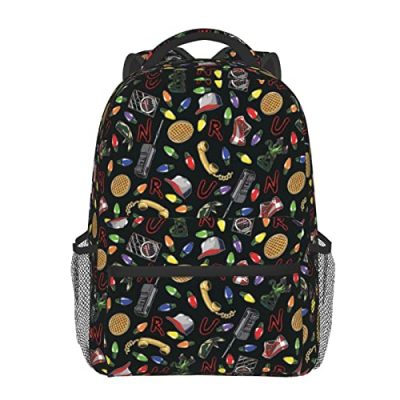 The Backpacks Stranger School Things 15.6 Inch Laptop Student School Book Bag Travel Hiking Camping Daypack is a versatile backpack suitable for various activities. It is designed with personalized graphics and made from eco-friendly waterproof lightweight polyester. The main compartment offers ample space for your laptop, iPad, books, and other essentials. It also features small interior and zipper pockets to keep your belongings organized. With its thick sponge handles and colorful prints, this backpack is perfect for teenage boys and girls, primary and middle school students, and college students. It can be used for travel, camping, hiking, and more. Hand wash and maintenance instructions are included. Overall, it is a great gift option for fans of the TV show Stranger Things.
