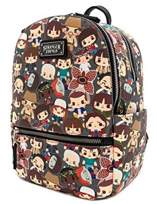The Loungefly Stranger Things Baby Characters Chibi All Over Print Mini Backpack is the perfect accessory for fans of Stranger Things. This officially licensed product features a fun and unique all-over print design of classic and unique versions of your favorite characters in chibi style. The backpack is made of dual reinforced padded faux leather and nylon shoulder straps, ensuring comfort and durability. It has one main zipper pocket, a small front zipper pocket, and two side pockets, providing ample storage space. The dimensions of the backpack are H: 11" x L 9" x W 5". With its vibrant design and practicality, it's a great gift for any Stranger Things fan. Score: 9/10
