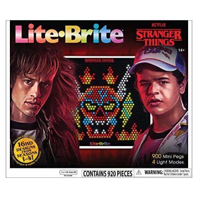 Create art with light using the Lite-Brite Stranger Things Special Edition Demogorgon Hunters set. This Amazon Exclusive features a high-definition grid, 16 HD templates, 900 mini pegs, stickers, and a branded storage pouch. With more holes and more definition than the Ultimate Classic, this set allows for detailed artistry. It also includes 4 color-changing light modes to illuminate your designs. The special edition set is perfect for Stranger Things fans and makes a great gift. Suitable for ages 14 and up, it comes in retro packaging for added nostalgia. Whether you use the exclusive design templates or create your own, Lite-Brite Stranger Things Special Edition offers a fun and creative experience.