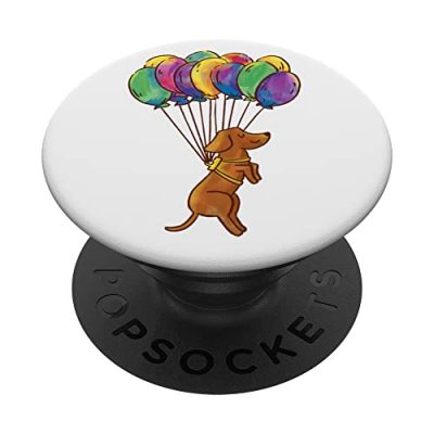 Get this cute dachshund animal dog floating away with balloons. This PopSockets Swappable PopGrip features a fun and adorable design that is perfect for animal and hot air balloon lovers. It is great as a gift for men, women, kids, and children. The PopGrip can be switched out for another design or removed completely for wireless charging capabilities. It also comes with an expandable stand, allowing you to watch videos, take group photos, and have handsfree video calls. The advanced adhesive ensures easy removal and repositioning on most devices and cases. Please note that it may not stick to certain silicone, waterproof, or highly textured cases. Works best with smooth, hard plastic cases. Suitable for iPhone 11, but not for iPhone 11 Pro or iPhone 11 ProMax without a suitable case.