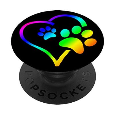The Rainbow Dog Paw Print Rescue Lover Gift Heart Black PopSockets Swappable PopGrip is a cute and unique accessory for your cell phone or tablet. It features a heart-shaped paw print design that is perfect for dog lovers. The PopGrip is swappable, allowing you to switch out the top for another design or remove it completely for wireless charging. It also has an expandable stand for handsfree use during video watching or group photos. The advanced adhesive allows for easy removal and repositioning on most devices and cases. However, it may not stick to silicone, waterproof, or highly textured cases. The Black color adds a sleek and versatile look to your device. Overall, customers have rated this product 4.4 out of 5.