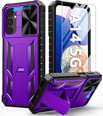 The FNTCASE Case for Samsung Galaxy A14-5G is a military-grade drop-proof protection rugged case that offers full-body protection for your phone. Made of premium hard PC and flexible TPU, this case comes with a tempered glass screen protector to prevent scratches. It features built-in airbags in the corners for cushioning from drops and a sliding window design to protect the camera lens and your privacy. The case also has a built-in kickstand that works in both vertical and horizontal positions for hands-free viewing. With its tire texture design and non-slip stripes, it provides a secure grip. The case is a perfect fit for the Samsung Galaxy A14-5G, with precise cutouts for easy access to ports and buttons. Overall, it offers great protection and functionality at an affordable price.