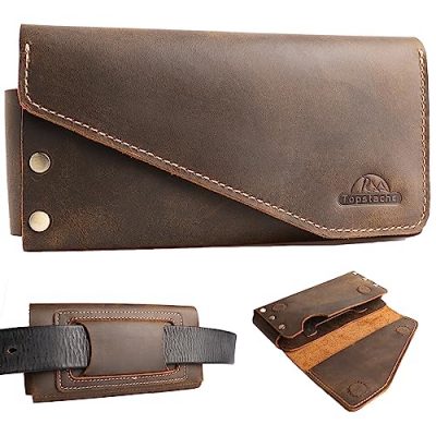 The Topstache Leather Phone Holster is a stylish and practical accessory for your smartphone. It is handcrafted from premium natural leather and offers a secure and convenient way to carry and protect your phone. The holster comes in two sizes to fit almost any size of smartphone with a protective case. It features two pockets for storing not only your phone but also cards, ID, and some cash. The flip cell phone case is designed with a magnetic closure for easy use. The leather material is scratch-resistant, durable, and ages beautifully over time. This phone holster makes for a great gift choice for anyone who wants a stylish and functional way to carry their phone.
