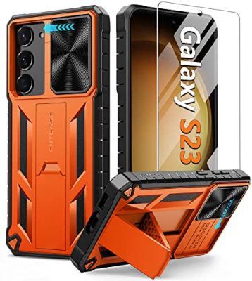The FNTCASE for Samsung Galaxy-S23 Phone Case offers full body protection with its premium hard PC and flexible TPU materials. It comes with a tempered glass screen protector to prevent scratches and has built-in airbags for cushioning against drops. The case features a sliding window design to protect the camera lens and maintain privacy. With a built-in kickstand, you can enjoy hands-free viewing in both vertical and horizontal angles. The tire texture design and non-slip stripes ensure a secure grip. This case is specifically designed for Samsung Galaxy S23 5G, providing precise cutouts for easy access to all ports and buttons. Overall, it offers solid protection and functionality for your phone.