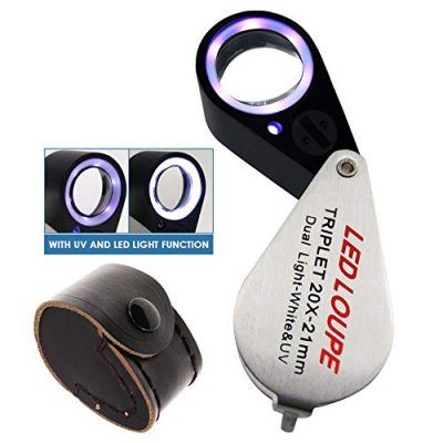 The 20x Magnifier Loupe Jewelry Jewelers Foldable Pocket Illuminated Magnifying Tool is a versatile 2-in-1 loupe featuring 6 Ultra Bright LED and U V light to verify the authenticity of precious gems, pictures, and notes. The lens has been precisely aligned to eliminate chromatic and spherical aberrations, providing the clearest and most accurate image. With its innovative lighting system and customizable design, this loupe is perfect for both home and industrial use. It is ideal for jewelry makers, coin collectors, stamp enthusiasts, and more. The loupe comes in a compact size, making it handy for a wide range of tasks. However, some customers have experienced issues with battery life and the effectiveness of the magnification for reading inscriptions. Overall, it is a good quality magnifier loupe with useful features.