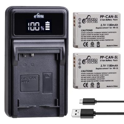 The NB-5L Batteries and LED Charger Set is a high-quality and reliable solution for Canon PowerShot S100, S110, SD700 is, SD790 is, SD800 is, SD850 is, SD870 is, SD880 is, SD890 is, SD900 is, SD950 is, SD970 is, and SD990 is cameras. This set includes two 1180mAh high-capacity batteries that use high-quality cells to provide longer battery life with no memory effect. The smart LED charger displays the battery's charge level and indicates the charging process, preventing overcharging. With its multiple charging options, including a micro-USB input, this charger can be conveniently powered by power banks, wall chargers, car chargers, and other USB devices. Built with multiple circuit protection and high-quality, fire-resistant construction, this battery and charger set offers a safety guarantee for prolonged use.