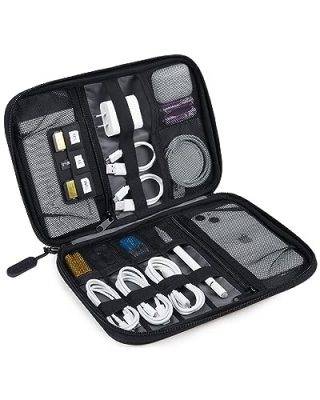 The BAGSMART Electronics Organizer Travel Case is a compact and lightweight bag designed to keep all your gadgets and cables organized while you travel. It features multiple compartments and pockets to store portable hard disks, thumb drives, SD cards, and various cables and chargers. The case has double zippers opening for easy access and elastic loops to keep your gadgets secured in place. Made with water-resistant fabric and padding, it offers durability and protection for your important devices. With its compact size, it fits perfectly into backpacks, briefcases, handbags, or laptop bags. Whether you're traveling or in the office, this travel tech organizer is a great partner for your gadgets.