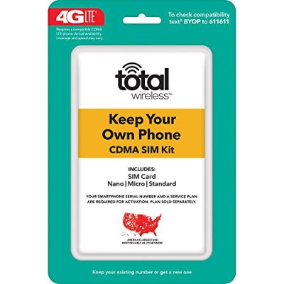The Total Wireless Keep Your Own Phone 3-in-1 Prepaid SIM Kit allows you to activate your phone with Total Wireless. It offers nationwide coverage on America's largest 4G LTE network and is compatible with most CDMA smartphones. The kit comes with a universal SIM card that works with Micro, standard, or Nano SIM cards. It does not work on GSM based phones. Total Wireless offers affordable plans starting at just $25/line, with unlimited talk and text. Keep your current phone, network, and phone number. Note that the phone must be carrier locked and meet certain activation requirements. The kit does not include a plan, which must be purchased separately.