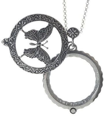 The Butterfly 4X Magnifier Magnifying Glass Sliding Top Magnet Pendant Necklace is a stylish and functional accessory that combines fashion and practicality. The necklace measures 30 inches long and features a beautiful butterfly pendant. The pendant slides open to reveal a 4x magnifying glass, perfect for those who struggle with small print or need a visual aid on the go. With a magnet closure, the pendant securely slides back into place when not in use. It comes with a gift box and non-tarnish white cotton, making it ready to gift. This necklace is a great choice for anyone who wants to add a touch of elegance to their everyday life while also having a convenient magnifying glass within reach.