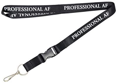 The 'Professional AF' Lanyard Keychain and ID Holder is a funny and practical accessory for the professional with a sense of humor. Made with durable black nylon, this lanyard features a detachable buckle for convenience. It can hold various items such as ID badges, USB drives, key fobs, and more. The premium nylon fabric ensures durability and vibrant color. With a double-sided print graphic, it's clear to everyone that you're 'Pro AF'. Available in the color 'Professional Af' and standard size. Customers have given it a rating of 4.7/5 based on reviews. It offers great quality, fast shipping, and a fair price. The only downside is that the letters may come off after some use.