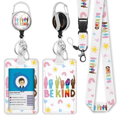 The Be Kind Lanyards for Id Badges is a fashionable and cute badge holder that comes with a breakaway lanyard and a retractable badge reel. The badge holder is made of durable ABS material and can fit two credit cards. The retractable badge reel has a 360-degree swivel carabiner clip, allowing for versatile usage. The lanyard is detachable and adjustable, and the breakaway clasp ensures safety. This novelty design lanyard is perfect for nurses, teachers, office staff, and more. It also makes for a great gift. Overall, it is a stylish and functional accessory for holding ID badges.