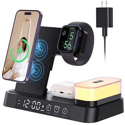 The Wireless Charging Station – 4 in 1 Wireless Charger with Alarm Clock is a highly practical accessory for anyone with multiple devices. It offers an all-in-one solution for charging your iPhone, AirPods, Apple Watch, and even functions as an alarm clock. The wide compatibility ensures that it works with various mobile phones and wireless earbuds. With its intelligent chipset, it provides a safe and reliable charging experience. The customizable alarm clock function adds convenience to your daily routine. However, it does have some minor drawbacks, such as inconsistent connection indicators and complicated alarm setup. Overall, it is a fantastic addition to any home or office setup, keeping all your devices organized and charged.