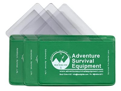 The Best Glide ASE Credit Card Size Fresnel Lens Fire Starter and Magnifier Lenses are a versatile tool for your survival kit. This 3 pack of green lenses is compact and lightweight, making it easy to carry in your wallet, purse, or emergency bag. Made of Optical PVC, these lenses provide up to 4X magnification, making it convenient to read small print or use in low light situations. In addition, these lenses can be used as an emergency fire starter on sunny days. Simply direct sunlight through the lens onto your tinder to start a fire. With its compact size, magnification capabilities, and fire starting functionality, the Best Glide ASE Credit Card Size Fresnel Lens is a valuable tool for any outdoor enthusiast or emergency preparedness kit.