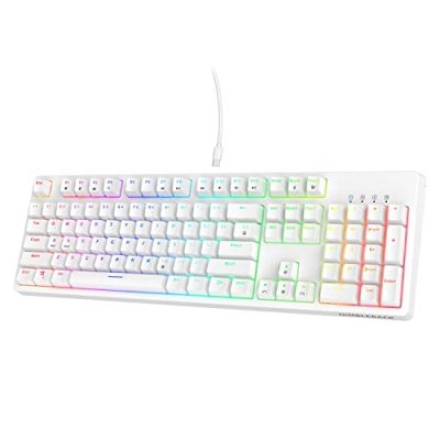 The LTC NB1041 Nimbleback Wired Mechanical Keyboard is a hot-swappable, backlit gaming keyboard perfect for nimble gamers and quiet typists. Equipped with a detachable Type-C wired connection, this keyboard ensures high-speed and stable data transmission. With 18 factory pre-programmed backlight modes and customizable LED lighting effects, it offers a visually stunning experience. The 104-key rollover and anti-ghosting function guarantees accurate keystrokes, even during fast typing or gaming sessions. The LTC NB1041 also comes with professional software support for customizing macros and RGB lighting. Made with a quality metal board and stable construction, this keyboard provides durability and stability. Overall, it's a great option for both gamers and typists.