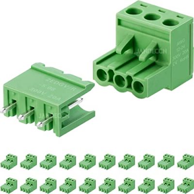 The JANDECCN 20 Sets 3 Pin 5.08mm Pitch Male Female Plug-in PCB Mount Screw Terminal Block Connectors Assortment Kit is a versatile and reliable solution for wire connections. Made from high-quality plastic PA66, these terminal blocks are resistant to high temperatures and are flame retardant. With a pitch of 5.08mm, a rated value of 20A 300V, and a wire range of 12-24AWG, these connectors offer excellent performance. They have a withstanding voltage of AC1500V/1Min and a torque of 0.5 Nm (4.5lb-In). These screw terminals are easy to install and detach, thanks to the PCB din rail adapter. They are widely used in electronics, communication equipment, instruments, computers, automatic control systems, household appliances, and more. Whether for Arduino wire connection or power modules, these connectors are reliable and efficient.