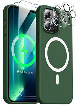 The MOZOTER 6-in-1 Silicone for iPhone 13 Pro Case offers a stylish and functional solution to protect your device. With a built-in magnet for seamless alignment with Magsafe accessories, this case allows for easy wireless charging and attachment of other Magsafe accessories. The triple-layer design provides comprehensive protection against scratches, drops, and impacts, while the raised edges safeguard the camera and screen. The soft anti-scratch microfiber lining and excellent grip prevent dust and dirt from entering your phone. The set includes 2 pcs screen protectors, 2 pcs camera lens protectors, and the triple-layer case for ultimate protection. With its attractive grass green color, this case combines style and functionality to enhance your iPhone 13 Pro experience.