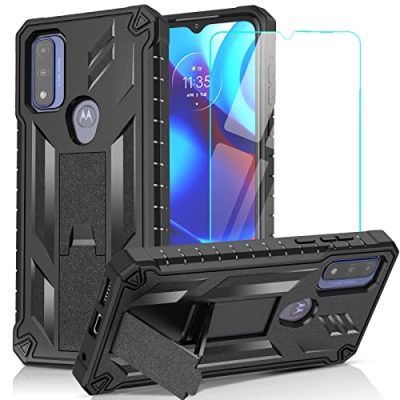 The Motorola Moto G Pure Case offers military-grade drop proof protection for the Motorola Moto G Pure (2021). It features a rugged design with a matte textured bumper, providing a heavy-duty shockproof TPU grade armor phone cover. The case comes with a built-in kickstand that can be used as a ring holder and offers hands-free portrait and landscape viewing angles. The anti-slip design ensures a secure grip, and the precise cutouts allow easy access to all ports and buttons. With soft TPU shock absorbing frame and air corner bumpers, it provides excellent shockproof and anti-drop protection. The case also includes a HD tempered glass screen protector for added protection. Available in black.