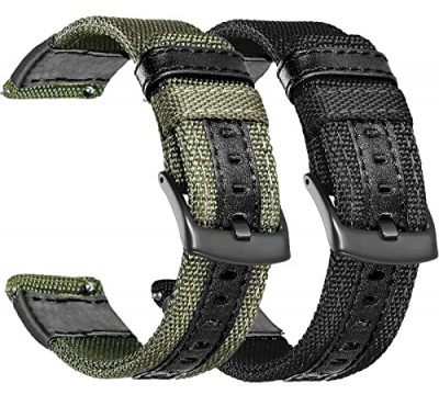 The Olytop Galaxy Watch Bands are stylish and durable replacement straps for various Samsung smartwatches and other compatible models. Made with high-quality nylon and leather, these bands are wear-resistant, waterproof, and extremely durable. They feature a breathable design with air holes, making them comfortable for daily work and exercise. The bands come in a pack of two, with a black and army green color option. With a quick-release mechanism, they are easy to install and adjust according to individual wrist sizes. Whether you're going to the gym, office, or a dinner date, these bands are versatile enough to accompany you. Perfect for yourself or as a gift, these bands offer a cost-effective alternative to official Samsung bands.