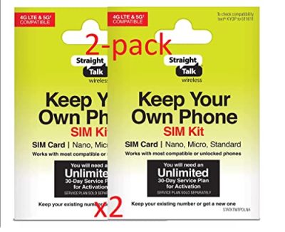 The 2 Pack – Straight Talk SIM Card BYOP Bring Your Own Phone Sim Kit is the perfect solution for those looking to convert their current compatible phone into a prepaid phone. With no contract and powered by Verizon network, this kit offers non-stop nationwide coverage. Each kit includes Nano, Micro, and Standard SIM cards, as well as a Network Access Code required for activation. The kit allows you to bring your own phone to America's largest and most reliable network and bundle it with Unlimited Talk, Text, and Data. It is compatible with CDMA phones like Verizon iPhones and Galaxy phones, and easily transferable from other carriers, with mobile hotspot enabled.