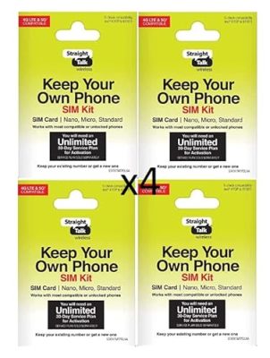 The 4 Pack – Straight Talk SIM Card BYOP Bring Your Own Phone Sim Kit – Verizon Network is the perfect solution for anyone looking to convert their current compatible phone into a prepaid phone. Powered by the Verizon network, this kit provides non-stop nationwide coverage. With the 3-in-1 Sim Card Kit, you can choose between micro, standard, or nano sim cards to fit your phone. Bring Your Own Phone to America's largest and most reliable network and enjoy Unlimited Talk, Text, and Data. Each kit includes Nano, Micro, and Standard SIM cards, as well as a Network Access Code required for activation. Transfer from another carrier is easy, and you can keep your old phone number. This kit is not compatible with AT&T or GSM phones. Simply text BYOP TO 611611 to check phone compatibility before making a purchase.