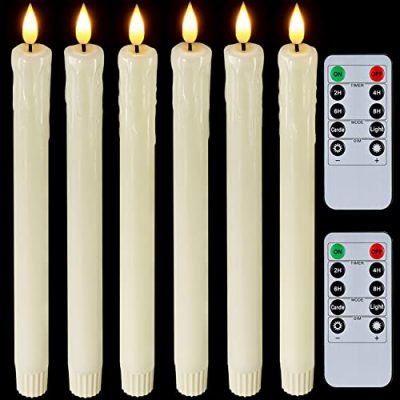 The Yeelida Battery Operated Flameless Taper Candles with Two Remote Timer are an ideal choice for adding a warm and cozy ambiance to your living space. Measuring 6.4 inches and featuring a 3D-wick design, these flameless taper candles look incredibly realistic, making them perfect for table and living room decor. With the included 10-key remote control, you can easily turn the candles on/off, adjust the brightness, choose between flickering/non-flickering modes, and set a timer for 2/4/6/8 hours. These LED taper candles are battery operated and can work for over 450 hours, meaning you won't have to replace the batteries frequently. The pack includes six ivory candles, two remote controls, and a user manual. With their automatic timer and long-lasting warm light, these flameless candlesticks are a convenient and safe alternative to traditional candles.