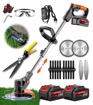 • Service & Packaging: 1 x Weed Wacker Battery Powered, 2 x 4.0A Battery Pack, 1 x Power Adapter, 2 x Saw Blades, 3 x Metal Blades, 10 x Long Nylon Blades, 20 x Easy Nylon Blade, 30x Easy Spools, Work gloves and safety glasses