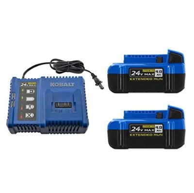 The Kobalt 24-Volt Max 2-Pack 4 Amp-Hour Lithium Power Tool Battery Kit is a starter kit that includes two 4.0Ah batteries and a 110W quick charger. The batteries have a power indicator to show the remaining power, while the quick charger features an automatic cooling system. These batteries are compatible with all Kobalt 24-volt tools, and the charger can be used to charge all Kobalt 24-volt batteries. The color is black, and the dimensions are 12.00Lx3.00Wx12.00H. With a customer rating of 4.5/5, this battery kit is highly regarded for its compatibility, power indicator, and high capacity.