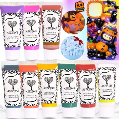 Create a magical world with ASTRYAS Simulation Fake Whipped Cream Glue. This DIY phone case kit includes nine 50ml simulated whipped cream glues, 14 plastic cake decorating tips, and a pack of random resin decorations in vibrant Fall colors. Made with high-quality ingredients, the non-toxic glue is easy to squeeze and smells sweet. It's perfect for creating unique mobile phone cases, earphone cases, photo frames, and any handmade crafts. The thick formula holds its shape well, making it ideal for cupcake frosting or autumn-themed DIY crafts. Simply screw on the icing tips, paste the resin decorations, and wait for it to dry. The water-based glue dries naturally and maintains its shape, while the full drying process may take 2 to 3 days depending on the ambient temperature. Please note that the glue may harden in temperatures below -10 degrees Celsius. Overall, ASTRYAS Simulation Fake Whipped Cream Glue offers a fun and creative way to customize your crafts.