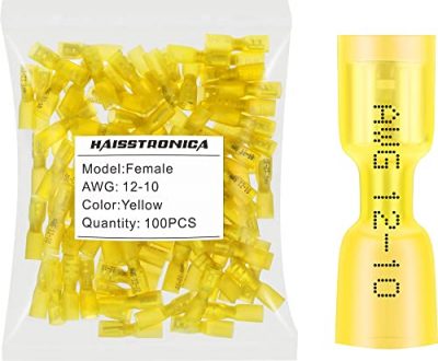 The haisstronica 100pcs Yellow Heat Shrink Female Spade Connectors are specially designed for wire gauge AWG 12-10. These connectors are made of tinned copper, which prevents oxidation and increases electrical conductivity. The thick heat shrink tubing ensures that the connectors won't break or puncture during the crimping process, and forms a firm seal after heating. The brazed seam and exquisite craftsmanship guarantee a secure and rock-solid crimp, providing long-term reliability. With a neat design and stable performance, these connectors are suitable for motorcycles, automobiles, tractors, boats, and more. The haisstronica Yellow Heat Shrink Female Spade Connectors come with a 30-day money-back guarantee and a 12-month replacement warranty, giving customers a risk-free purchase experience.