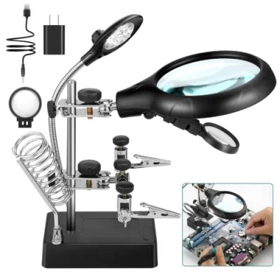 The Helping Hands Soldering Station with Magnifier Light is a useful tool for amateurs and professionals alike. With its multiple magnifiers and adjustable clips, it provides a hands-free experience, making soldering and other fine work much easier. The bright LED light and stable base further enhance its functionality. While some users experienced issues with the stiffness of the arms and the stability of the base, overall, it offers great value for its price. Whether you’re working on PCB soldering, craft projects, or electronic repairs, this magnifying glass with light is a reliable companion.