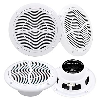 The STUDIOFINIX 6.5 Inch Marine Bluetooth Speakers are the ideal choice for those looking to enjoy a full and rich sound experience in open-air environments. These water-resistant speakers are compatible with Bluetooth-enabled devices and have a range of up to 16-48ft. They are perfect for use in boats, UTVs, cars, ATVs, and at home. With their weather-resistant design and heavy-duty molded ABS plastic basket, they are built to withstand harsh outdoor conditions. The speakers feature a power handling of up to 120 watts, a frequency response of 60Hz-18Khz, and a 4 Ohms impedance. This pack includes 2 pairs of 6.5 inch marine speakers, cables, amplifiers, power supplies, and a manual. Overall, the STUDIOFINIX 6.5 Inch Marine Bluetooth Speakers deliver great sound quality and perform well in outdoor settings.