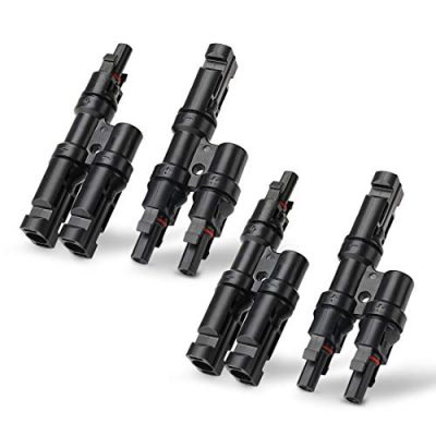 The BougeRV Solar Connectors Y Branch Parallel Adapter Cable Wire Plug Tool Kit is a versatile and reliable accessory for solar panels. This kit includes 1 male to 2 female (M/FF) and 1 female to 2 male (F/MM) solar connectors, allowing you to connect 2 solar panels in parallel. With a rated current of 20A and a rated voltage of DC1000V, the connectors are suitable for various solar cables ranging from 14-10AWG (1.5mm² – 6mm²). The connectors are IP67 waterproof, thanks to the built-in waterproof ring in the male connector and the high-quality PPO material that resists water, dust, ultraviolet rays, and high temperatures. Installation is quick and simple with the plug-and-play design. The connectors have received positive reviews for their durability, ease of use, and compatibility with different panels.