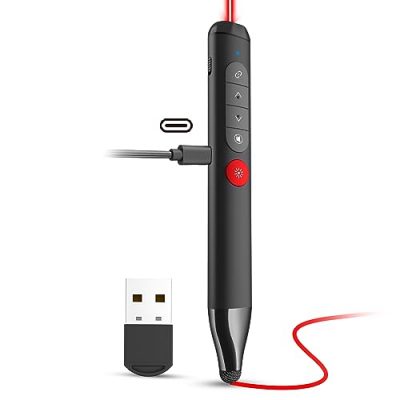 The KTPYRP Wireless Presentation Clicker is a versatile and feature-packed remote clicker designed for presentations. With its bright red laser pointer, long range control, and multiple functions, it is perfect for teachers, presenters, and professionals alike. The clicker features a Stylus Pen design for touch screens, allowing for easy navigation and marking during full screen slide mode. It also has a Mute Function for long range control, making it convenient for muting audio during presentations. The clicker supports plug and play, with a USB-A receiver for easy connectivity without any software or installation. It is compatible with various operating systems and presentation software, and its compact design allows for easy portability. Overall, the KTPYRP Wireless Presentation Clicker offers a powerful and convenient solution for making engaging and professional presentations.