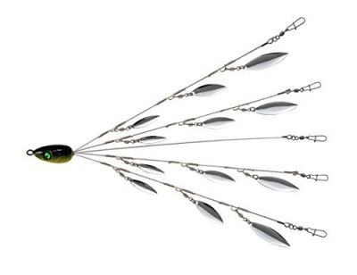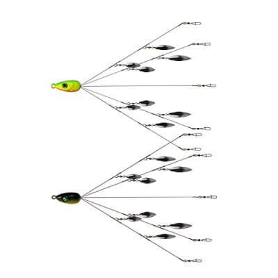 The 5 Arms Alabama Umbrella Rig Fishing Ultralight Tripod Bass Lures Bait Kit is a fantastic product for anglers seeking to attract fish with a realistic school of shad appearance. This rig features 8 willow leaf blades that create a vibrant and eye-catching display in the water. It is particularly effective for striped bass and sand bass in open water. The blades are designed to stay in place while spinning, ensuring the swim baits are spread out enough to achieve a lifelike 'schooling effect'. Although the rig is a bit heavy, it works well when loaded with Alabama rigs for bass fishing. The product comes with a 1-year warranty and makes for a great gift option. With its excellent performance and affordable price, the 5 Arms Alabama Umbrella Rig Fishing Ultralight Tripod Bass Lures Bait Kit is definitely worth considering for any fishing enthusiast.