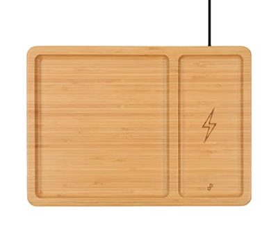 The PJ Collection Bamboo Valet Tray with Wireless Charging is the perfect organizer for your home office and bedroom nightstand. It features an elegant design made of bamboo, with two sections and raised edges to hold your jewelries, books, earphones, and other small items. The tray also doubles as a wireless charging station with a 15W charger at the center, compatible with all wireless charging phones and headphones. Safety is ensured with built-in overheat cut-off mechanisms and short circuit protection. Each bamboo tray is unique in pattern and grain, sourced from a small family-farm in Fujian Province, China. With an optimal charging distance, fast wireless charging is guaranteed. The PJ Collection Bamboo Valet Tray with Wireless Charging combines style, functionality, and convenience.